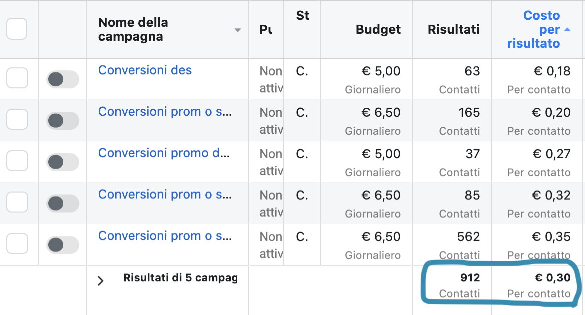Io come puoi vedere ho generato 912 contatti al costo medio di 0,30 € a contatto.