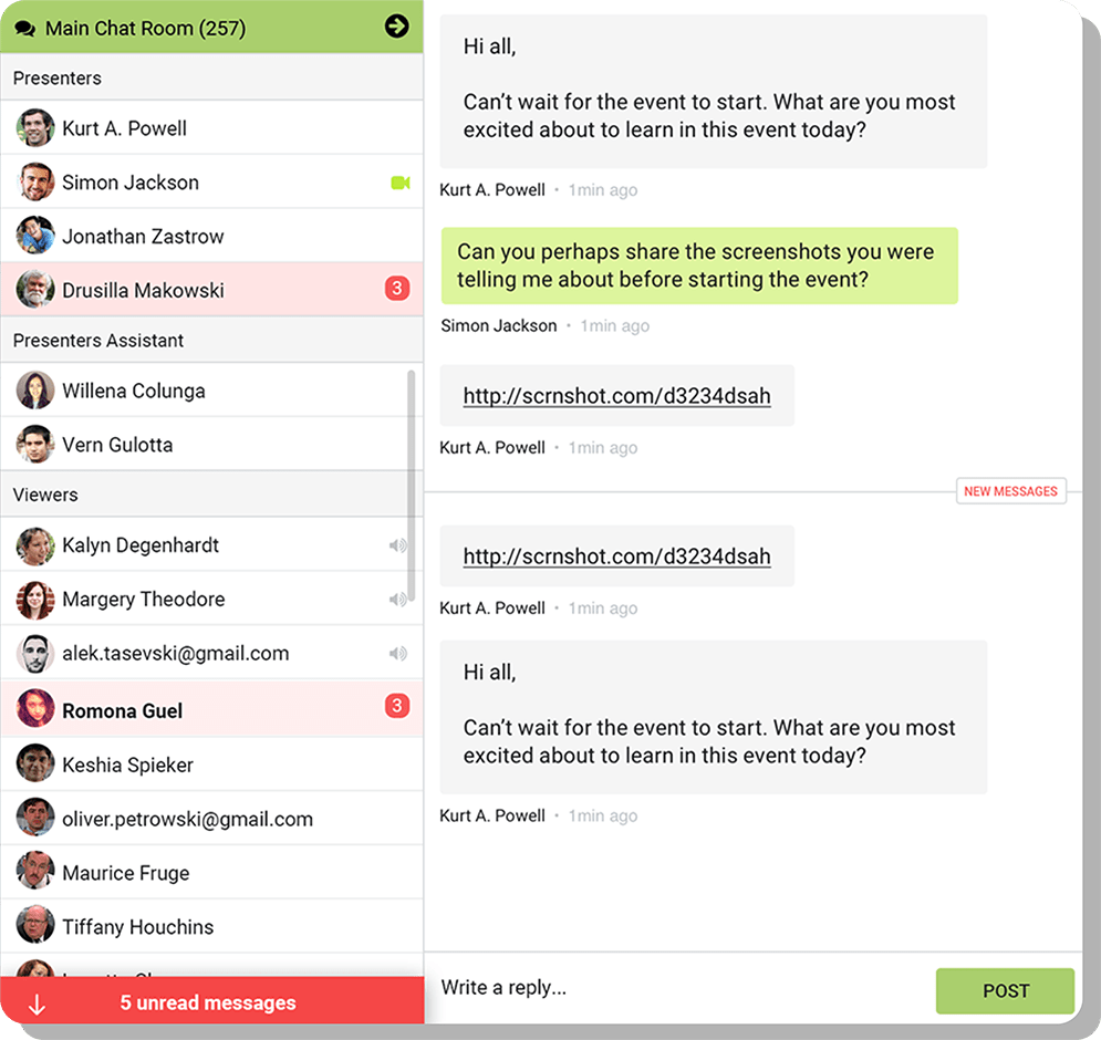 Coinvolgi e resta in contatto con i partecipanti durante le sessioni di chat in-webinar e in-video e continua le comunicazioni dopo l'evento dal vivo. Questo aiuta immensamente a migliorare le conversioni.