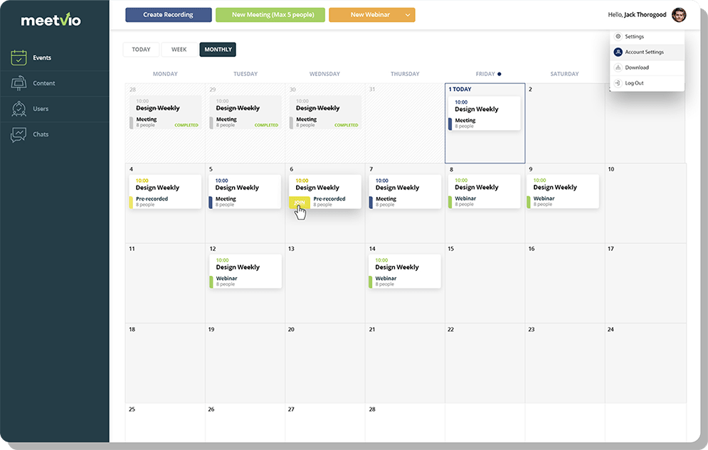 L'esclusiva visualizzazione del calendario di Meetvio è un'interpretazione intuitiva di una dashboard più convenzionale. Guarda cosa hai pianificato, con chi e quando ...